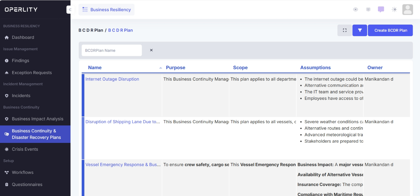 • Select "Business Continuity & Disaster Recovery Plans" to create and manage resilience plans.