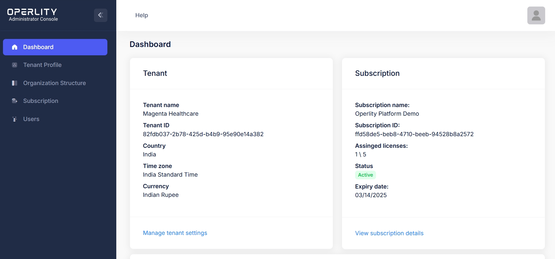 This section provides a quick overview of your organization's current subscription status and tenant configuration.
