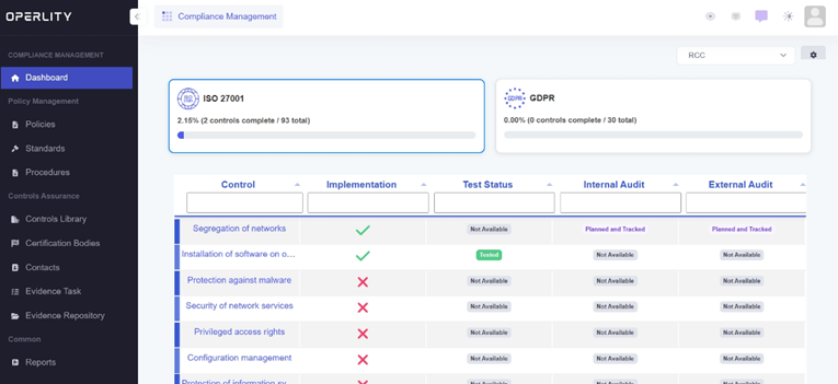Example: If ISO 27001 has been imported, you can see its controls and their implementation progress.