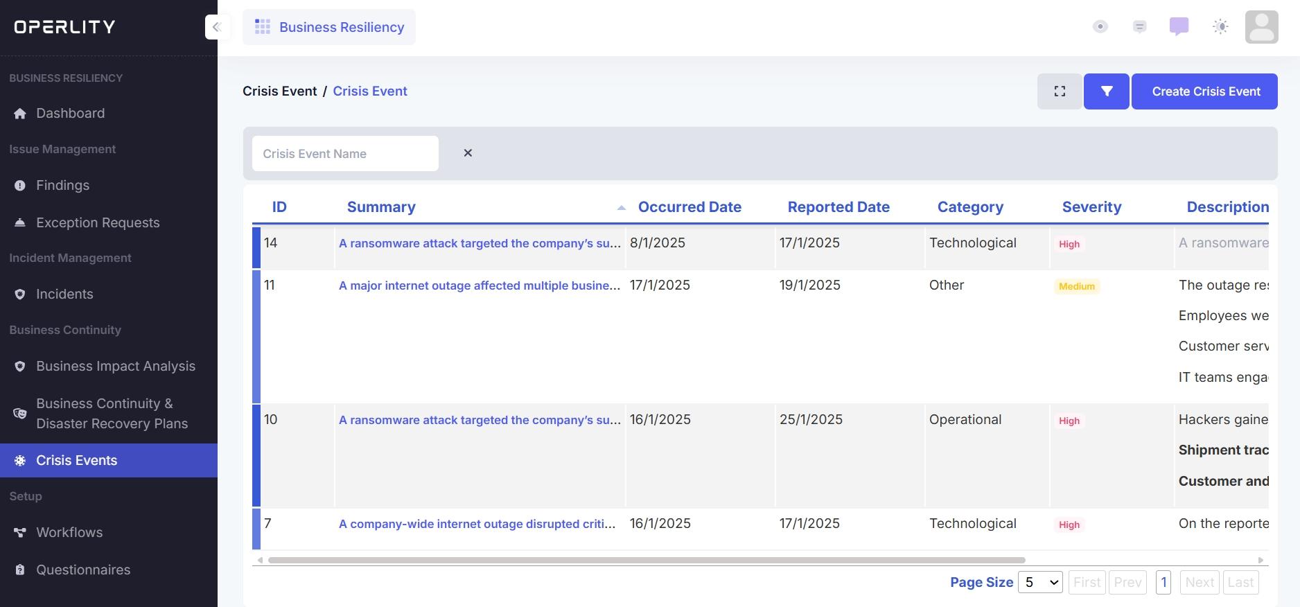 Example: If an internet outage disrupts business operations, log it under crisis events and categorize it under Technological Risk with Medium Severity.