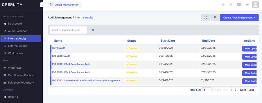 Audit engagements help organizations assess their compliance, security, and operational effectiveness. The Audit Management Module enables users to conduct structured internal and external audits, ensuring adherence to industry standards.