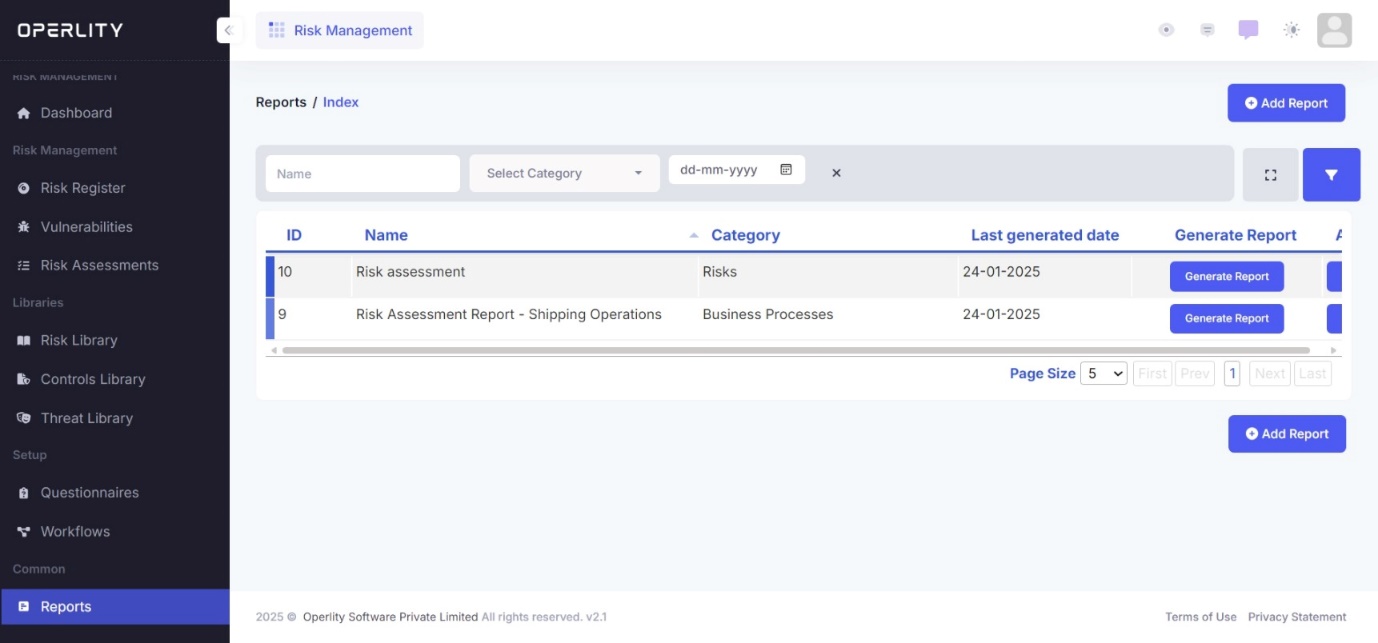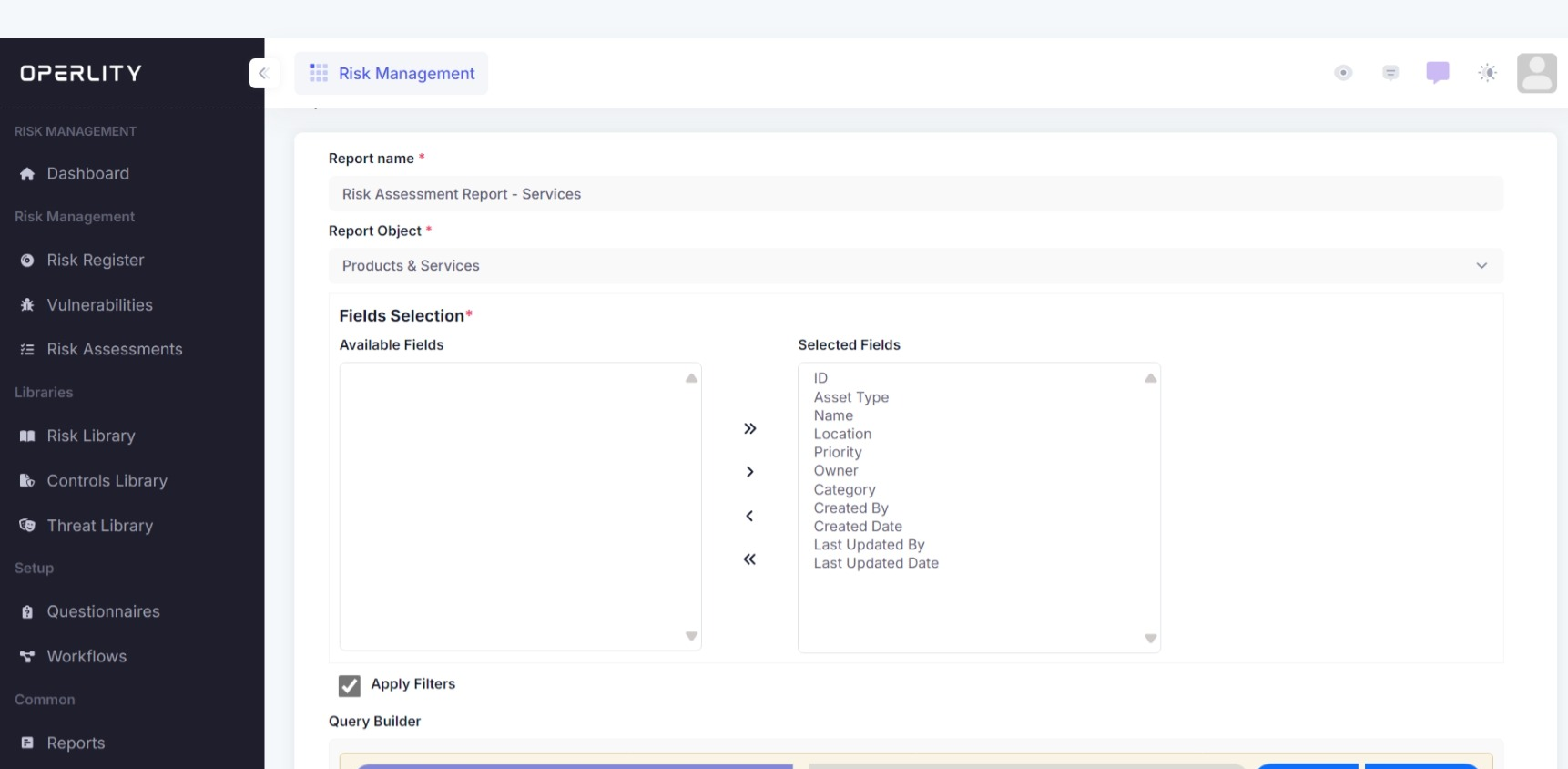 Example: If you're generating a Risk Report, you may select fields like Risk Category, Risk Owner, Mitigation Plan, and Priority.